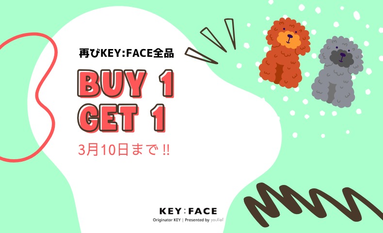 【期間限定】3月1日0:00から3月10日23:59まで、KEY:FACE製品をご購入いただくと、なんと!同じ商品をもう一つプレゼント。Youliefブランドの商品もこのキャンペーンの対象です。お友達へのギフトにも、自分へのご褒美にも、この特別な機会をお楽しみください。